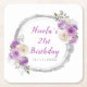 Beautiful birthday party sticker with a purple and silver faux glitter frame with floral flower arrangements. The words can be changed to suit your own details or requirements