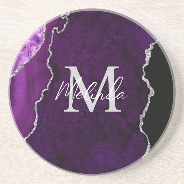 This coaster features an elegant and glamourous agate marble background with geode gemstone detailing and faux silver glitter accents. The monogram combines handwritten script and modern sans serif fonts for a classy and sophisticated look. This will make the ideal gift as it can be customised with a name and initial. The deep purple hues make it perfect for autumn fall and winter.