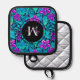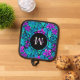 Pretty elegant pattern of purple, blue, teal, turquoise and green flowers and foliage personalised initial and last name potholder. Makes a great wedding or housewarming gift.