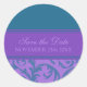 Save the Date envelope seals for wedding, in elegant teal blue and dark purple swirly flourish design, the perfect addition to your save the date card envelopes, available in matching cards and magnets.