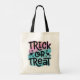This tote bag is designed to add a touch of elegance to your trick-or-treating adventures. With the words "Trick or Treat" beautifully displayed on both sides in a mesmerising watercolor palette of purple and teal green, it's a work of art that captures the spirit of Halloween.
