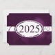 Floral designs surrounding button on top of a white ribbon that has floral designs. Purple cloudy background. The back of the card has a purple background with white lettering for the graduation announcements.