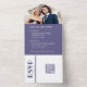 Elevate your wedding with our Modern Purple and White Wedding Invitation, featuring sleek modern fonts, sparkling wedding rings, and your favourite photo. This all-in-one invitation includes a convenient QR code that guides your guests to RSVP online, eliminating the need for traditional RSVP cards. Crafted with premium quality materials, personalise it with your unique details, and enjoy easy assembly and mailing. Make your wedding memorable from start to finish; explore our Purple and White Themed Wedding Collection today!