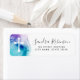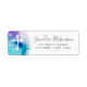 Elegant baptism, communion or confirmation return address labels featuring a white cross on a purple and aqua blue watercolor background and your name highlighted with a calligraphy script font.