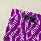 This beach towel has an Art Deco design of diamonds connected by curved lines in white on a field of purple.