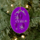 A graphic illustration of a purple awareness ribbon with snowflakes by artist designer Charmaine Paulson on a Christmas ornament. The ornament has the text "All i want for Christmas is a Cure" and text templates on the back for your personalisation.