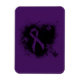 Purple ribbon in a heart with butterflies in a grungy-goth style. Wearing the ribbon in February for Macular Degeneration Awareness. In April for Animal Abuse Awareness, Sarcoidosis Awareness, Sjogren's Syndrome Awareness, Testicular Cancer. May for Cystic Fibrosis Awareness, Fibromyalgia Awareness, Lupus Awareness. September for ADHD Awareness, Thyroid Cancer Awareness, Victims of 9/11 - WTC Awareness Ribbons. November for Alzheimer's Disease Awareness, Colitis Awareness Ribbons, Crohn's Disease Awareness, Domestic Violence Awareness, Epilepsy Awareness, Homelessness Awareness, Pancreatic Cancer Awareness, Pancreatitis (Chronic) Awareness. The purple ribbon also stands for ADD Awareness, Anti-Violence Awareness, Arnold Chiari Malformation Awareness, Leimyosarcoma Awareness, Mucolipidoses Awareness, Mucopolysaccharidosis Awareness, No Unattended Kids in Cars Awareness, Religious Tolerance Awareness, LGBT hate crime awareness, bullying and suicide prevention.