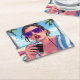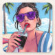 Cute beachy pop paper coaster. A cute comic book style cartoon illustration of a woman drinking a soda at the beach in purple sunglasses, bandanna and bikini.