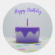 A purple cartoon birthday cake with sprinkle-covered frosting running down the sides and a lit candle sits on a golden plate on a counter covered in colourful dots.