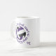 This sporty volleyball team colours coffee mug with monogram features the typographic phrase, "The volleyball court is my happy place" and two heart outlines in purple encircling a volleyball with purple, black and white coloured panels - customise with monogram - by katz_d_zynes