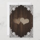 Romantic purple and blue floral wedding save the date card featuring floral hearts against a barn wood background adorned with white floral lace and string lights.