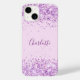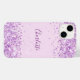 A blush pink background. Decorated with purple confetti. Personalise and add a name, written with a modern hand lettered style script. Purple coloured letters.