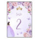 These lovely quinceañera table number cards feature a border of lilac purple and blush pink watercolor flowers on a pale lilac background. A gold tiara, a dark-haired girl in a lilac princess dress and small purple butterflies decorate the text. The word "table" and the number appear in purple handwriting script. Customise and order each card individually.
