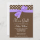 A stylish purple and brown baby shower invitation. Featuring polka dots and a purple bow graphic. Perfect for a little girl baby shower. Trendy and cute! Designs are flat printed illustrations/graphics - NOT ACTUAL RIBBON.