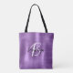 This elegant personalised tote bag features a monogram and first name in modern black and white script on a trendy purple brushed metal background.