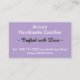 Handmade candles, or any business white typography against pretty pastel purple background. Crafted with Love typography in Black and via Personalise on right-hand side Text and Drop Shadows grey colours. Insert telephone number and website, or other information on front. Backside has white background with Purple border. Upload Logo. QR Code on left-hand side, and Pinterest (or other) social media link site on right-hand side. Click Personalze to change font colours, style, or sizes, move around text and images, or add or delete image placeholders not needed. Original Image and Design by TamiraZDesigns.