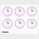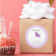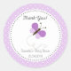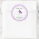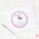 Round sticker for baby shower favour with purple butterfly design and light purple polkadot background.