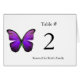 Lovely wedding or party reception table number tent card done in white, with graphics of a purple and black butterfly decorating the left side. Black text is customisable to read what you wish. Customise the number and text for each table you need a card for.