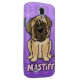 Pretty Purple Mastiff iPhone case for dog lovers! An adorable cartoon of the fawn dog breed sits in the centre, with a fun purple dot background. Below, the breed name is printed in thick pink letters. Very cute English Mastiff gifts.