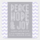 Send a contemporary greeting this holiday season. This sticker features the words "Peace, Hope & Joy" rendered in a modern typeface on a mauve coloured panel against a purple chevron patterned background. Great as a gift tag or a favour. Available in alternate colours with matching products.