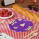 A colourful Christmas decor design, featuring snowflakes, Christmas trees and swirls scattered over a festive purple background.