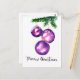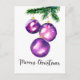 traditional watercolor artwork of colourful purple christmas ornaments hanging on a tree as a decorative postcard for the holidays