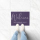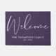 An elegant purple doormat featuring beautiful script calligraphy welcome and personalized with your family name and special date. Designed by Thisisnotme©