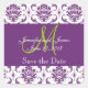 Green monogram, Purple and White Damask Save the Date Square Stickers. Layout by Elke Clarke. Graphics licensed. Need help coordinating wedding invitation packets for your wedding? Please contact luxuryweddinginvitations@gmail.com