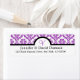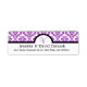 Purple Damask with white background lined with black border. Purple Monogram V on white background. Wedded couples name in black on a white background with black return mailing address text. This makes a perfect coordinated label to any damask wedding RSVP or invitation. Place these return address labels on the back of your wedding invitation envelopes or on the front left side of any envelope. Save yourself from hand writing your return address on all out going mail.