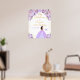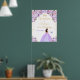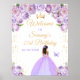 This elegant and glamourous birthday party welcome sign features a beautiful princess with dark skin in a light purple ball gown. The text combines handwritten script and modern sans serif fonts for a classy and sophisticated look. The floral arrangements, butterfly and gold confetti create the perfect blend of rustic and chic.