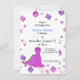A cute purple dinosaur with a sweet expression on his face, ready for a birthday party accents this fun invitation. A border of cubes and fun designs adds a fun appeal. Customise with all of your information as desired.