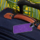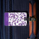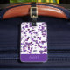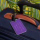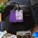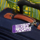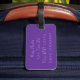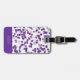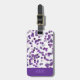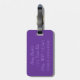 This luggage tag features a design of polka dots, in various shades of purple, and a bold purple stripe. The stripe, and background colour on the back, as well as the monogram and text, can all be customised as desired.