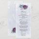 Beautiful romantic wedding menu card featuring dusty blue and purple flowers and some green leaves .