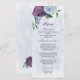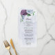 Beautiful romantic wedding menu card featuring dusty blue and purple flowers and some green leaves .