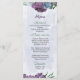 Beautiful romantic wedding menu card featuring dusty blue and purple flowers and some green leaves .