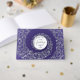This purple guest book features a striking damask design with decorative scrolls that add depth and beauty. The rich purple tones bring a sense of royalty and sophistication, making this a luxurious keepsake for weddings.