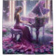 A lady in an elegant purple gown plays a floral-decorated piano amidst a dreamy lake of roses and glowing light. The image captures a magical blend of art and nature, perfect for decor or gifts.