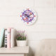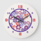 A fun wall clock with bold flowers with kaleidoscope centres create a funky pattern in shades of purple and coral.