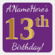 Purple, Faux Gold 13th Birthday + Custom Name Square Sticker
