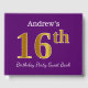 Purple, Faux Gold 16th Birthday Party; Custom Name Guest Book