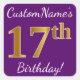 Purple, Faux Gold 17th Birthday + Custom Name Square Sticker