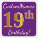 Purple, Faux Gold 19th Birthday + Custom Name Square Sticker