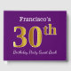 This guest book design features the ordinal number "30th" with a faux gold-like appearance. It also features a custom name, and a purple coloured background. It could be used at a party for somebody celebrating their thirtieth birthday. [~Z0000057]