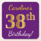 This simple paper coaster design features a message like "Caroline’s 38th Birthday!", with the "38th" having a faux/imitation gold-like colour appearance, on a purple coloured background. The name can be customised. Personalised paper coasters like these could perhaps be used at a birthday party for somebody who is celebrating their thirty eighth birthday. [~Z0000197]