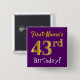 This simple square button design features a message like "First-Name’s 43rd Birthday!", with the "43rd" having a faux/imitation gold-like colouring look, on a purple coloured background. The name can be personalised. Buttons like these could perhaps be worn by guests at a birthday party for somebody who is celebrating their forty third birthday, where the party is being held in a large area with lots of other people present (such as a city park or a theme park). [~Z0000166]