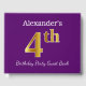 This guest book design features the ordinal number "4th" with a faux gold-like appearance. It also features a personalised name, and a purple coloured background. It could be used at a party for somebody celebrating their fourth birthday. [~Z0000057]