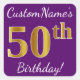Purple, Faux Gold 50th Birthday + Custom Name Square Sticker