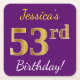 This simple paper coaster design features a message like "Jessica’s 53rd Birthday!", with the "53rd" having a faux/imitation gold-like colour appearance, on a purple coloured background. The name can be customised. Personalised paper coasters like these could perhaps be used at a birthday party for somebody who is celebrating their fifty third birthday. [~Z0000197]