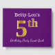 This guest book design features the ordinal number "5th" with a faux gold-like appearance. It also features a personalised name, and a purple coloured background. It could be used at a party for somebody celebrating their fifth birthday. [~Z0000057]