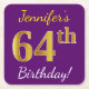 This simple paper coaster design features a message like "Jennifer’s 64th Birthday!", with the "64th" having a faux/imitation gold-like colour appearance, on a purple coloured background. The name can be personalised. Personalised paper coasters like these could perhaps be used at a birthday party for somebody who is celebrating their sixty fourth birthday. [~Z0000197]